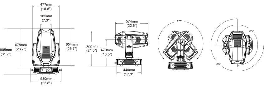| Угол поворота прожектора (PAN) | 540°; разрешение 8/16 бит |
